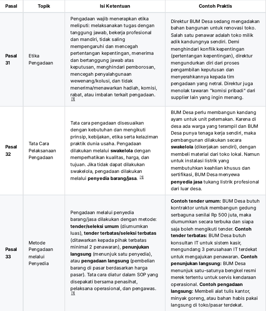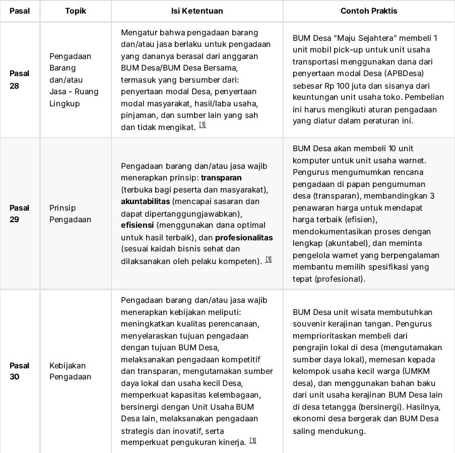 Dalam artikel ini, kami sajikan rangkuman Pasal 28-33 yang mengatur tentang ruang lingkup, prinsip, kebijakan, etika, tata cara, dan metode pengadaan barang dan jasa di BUM Desa. Setiap pasal dilengkapi dengan contoh praktis yang mudah dipahami, sehingga pengurus BUM Desa dapat langsung menerapkannya dalam kegiatan sehari-hari.